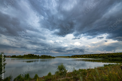 Fototapeta premium landscape with rain clouds. Dramatic sky over the pond.