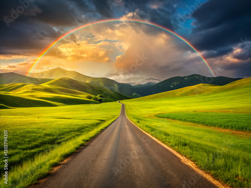 © Watcharakorn, Obraz premium landscape with rainbow. rainbow, sky, landscape, field, nature, road, clouds, grass, rain, meadow, cloud, storm, summer, green, weather, countryside, horizon, sun, spring, rural, farm, tree, sunset, e