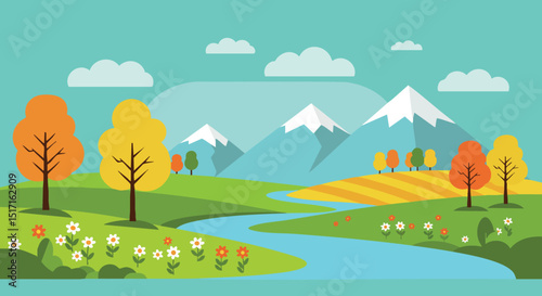© PixelPaletteArt, Fototapeta premium Landscape with River Mountains Autumn Trees and Flowers Natural Scene Vector Illustration