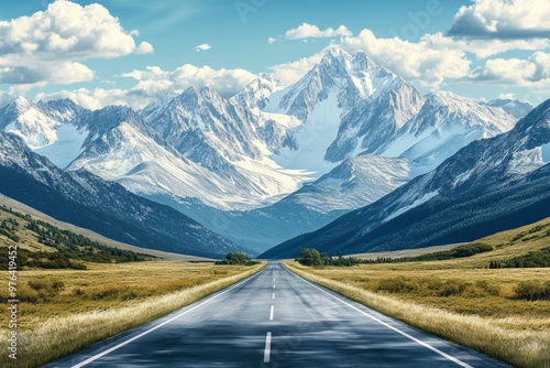 Fototapeta premium Landscape with road and mountains beautiful background --ar 3:2 --v 6.1 Job ID: bb56796d-3caf-40df-a88d-ef4755aa0fdf
