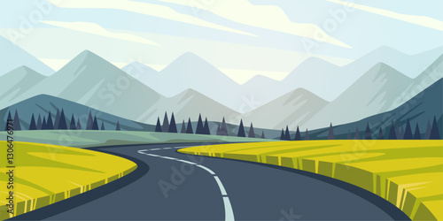 © YummyBuum, Fototapeta premium Landscape with road and mountains in background. Green lawn and mountains on background. Travel in auto. Summer scenery. Spring meadow. Cartoon flat isolated environment vector concept