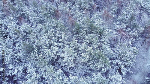 © Garmon, Obraz premium Landscape with snowy forest with dense young fir trees covered with snow.
