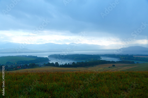 Obraz premium landscape with storm clouds, green and yellow meadow a lake