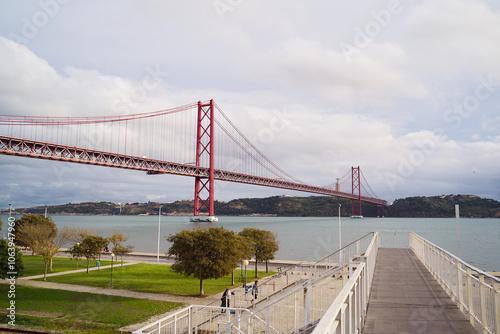 Fototapeta premium Landscape with suspension 25 April bridge bridge over the Tagus river in Lisbon, Portugal.
