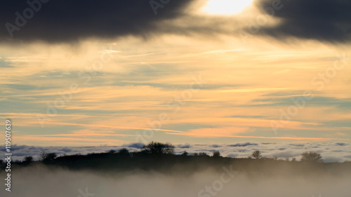 © kokophotos, Fototapeta premium Landscape with the sun setting behind clouds and fog