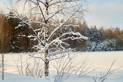 Fototapeta premium Landscape with tree in the foreground and field in the distance on a winter day