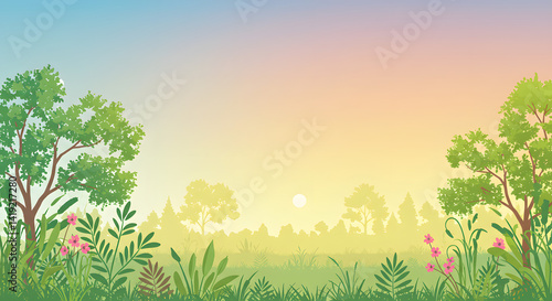Obraz premium Landscape with Trees and Flowers at Sunset