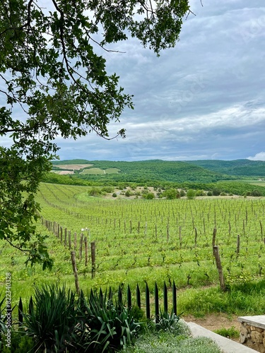 © Maryna, Naklejka premium Landscape with vineyards amidst green clouds and sky with clouds