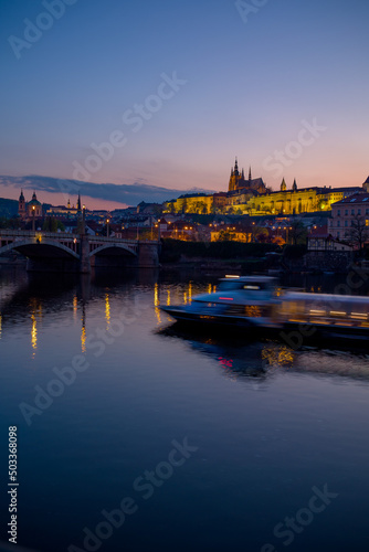 © Alliance, Fototapeta premium landscape with Vltava river, St. Vitus Cathedral and boat