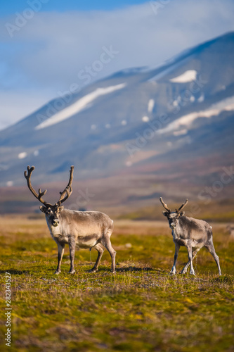 © bublik_polina, Naklejka premium Landscape with wild reindeer. Summer Svalbard. with massive antlers horns deer On the Sunset, Norway. Wildlife scene from nature Spitsbergen