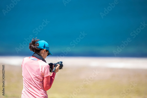 Obraz premium Landscape woman photographer taking photos in an amazing wilderness environment at Atacama Desert Andes mountains lagoons. A cut out silhouette over the blue waters with a mirror less camera shooting