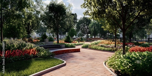 Fototapeta premium Landscaped Park with Brick Pathway and Flower Beds
