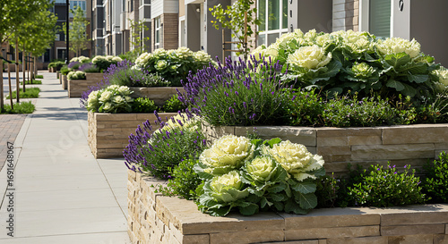 © MehediHasan, Fototapeta premium Landscaped walkway with ornamental cabbage and lavender