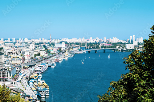 Obraz premium Landscapes of Kyiv, river station, pedestrian bridge, monument of The...