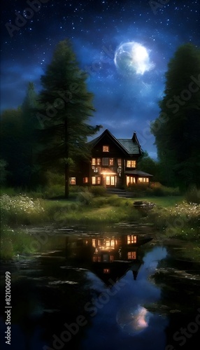 © nitroziklop7, Fototapeta premium Landschaft Märchenhaus am Teich. Hintergrund für das Design 1.