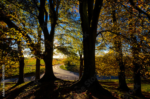 © Syn_chron, Fototapeta premium Landschaft mit Bäumen im Gegenlicht