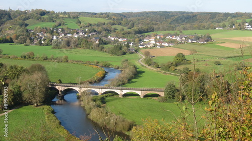 © KlausMJan, Obraz premium Landschaft mit Eisenbahnbrücke