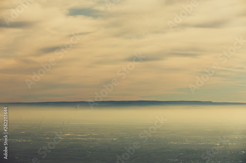 Obraz premium Landschaft Rheinebene mit Windrädern unter einer Nebeldecke und Wolkendecke