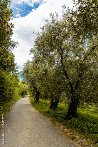 Fototapeta premium Landschaft vom Gardasee in Italien, Wanderweg in Torbole am Gardasee ohne Leute waehrend der , Hiking trail in Torbole on Lake Garda without people during the time with covid 19, with olive trees