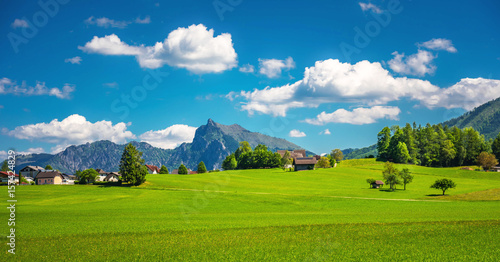 © defpics, Obraz premium Landschaftspanorama mit grüner Wiese und den Traunstein im Hintergrund, Salzburg, Österreich