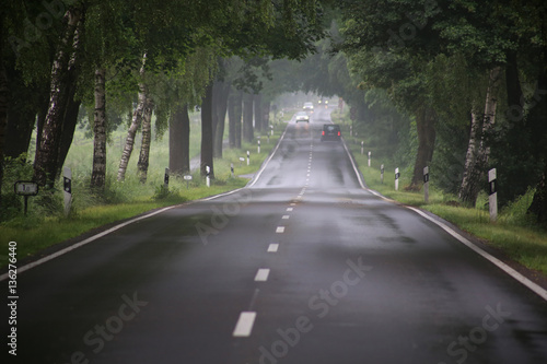 © fotofox33, Obraz premium Landstraße im Regen Allee Gefahr Sicherheit