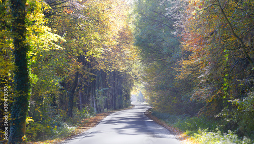 © bittedankeschön, Fototapeta premium Landstraße im Sonnenlicht durch eine Natur im Herbst