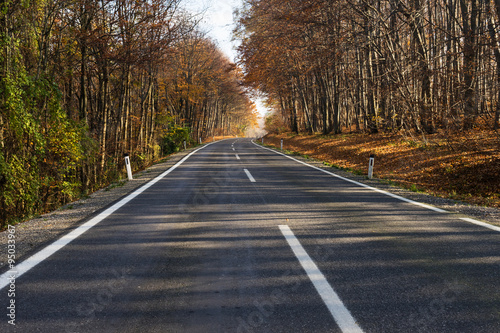 Fototapeta premium Landstrasse durch herbstlichen Wald