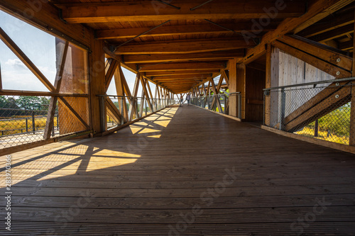 © ramonmaesfotografie, Fototapeta premium langer offener Gang eines Gebäudes in sichtbarer Holzkonstruktion