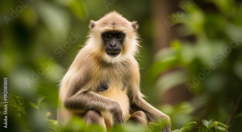 Fototapeta premium Langur monkey sitting in lush green forest environment