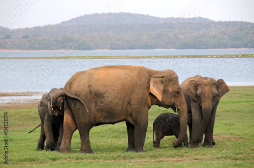Naklejka premium Lankesian Elephant Family (Elephas Maximus Maximus), Minneriya National Park,...
