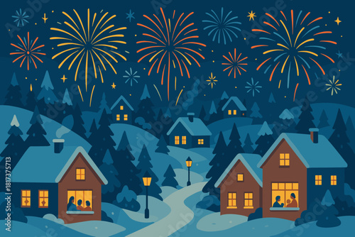 Obraz premium Lanterns festive watching night illustration fireworks from trees pine over windows vector