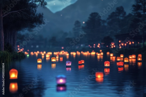 © YouraPechkin, Obraz premium Lanterns illuminate a serene waterway during an evening festival in a tranquil landscape