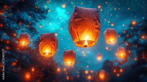 © S-Rika, Obraz premium Lanterns in the Night Sky Glowing Lanterns Rise in the Blue Night Sky