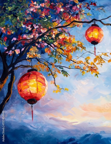 © J. Thamanoon, Obraz premium Lanterns on the New Year Tree