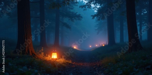 © Anulak, Obraz premium Lanterns shining through a misty forest at dusk, forest, darkness, shadow