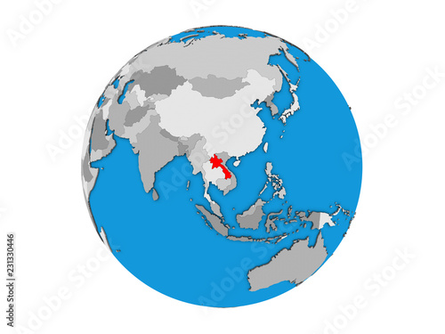 © harvepino, Fototapeta premium Laos on blue political 3D globe. 3D illustration isolated on white background.