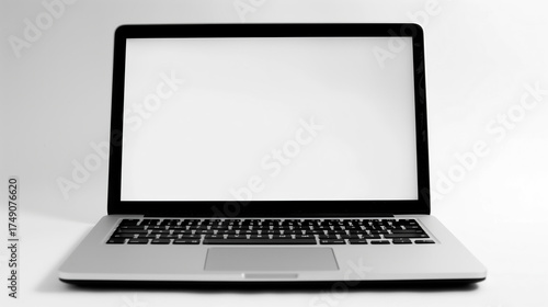 Fototapeta premium Laptop and Blank Screen: A modern laptop sits open, its screen displaying a blank canvas, ready for any creative endeavor or communication.