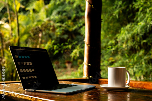 © 9dreamstudio, Obraz premium Laptop and cup on wooden table of terrace with tropical forest view at sunset, remote work digital nomad