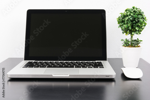 Fototapeta premium Laptop and flower pot on black wooden table