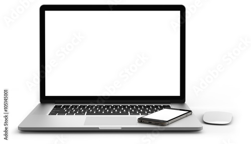 Fototapeta premium Laptop and smartphone with blank screen isolated on white background, aluminium body.Whole in focus. High detailed.