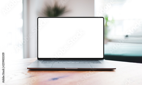 © guteksk7, Fototapeta premium Laptop blank screen mockup on table in living room - front view