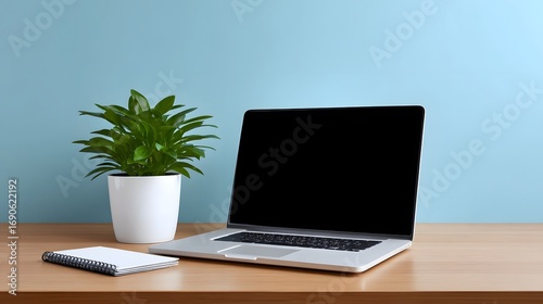 Fototapeta premium Laptop computer and a potted plant placed on a clean, wooden desk in a minimalist, contemporary office environment.