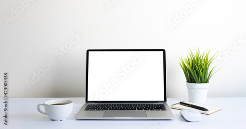 Fototapeta premium Laptop computer blank screen on white office desk table with coffee cup and notebook, mouse computer with equipment office supplies. Business and finance concept. Workplace, Flat lay with copy space.