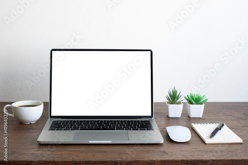 Fototapeta premium Laptop computer blank screen on wood office desk table with coffee cup and notebook, mouse computer with equipment office supplies. Business and finance concept. Workplace, Flat lay with copy space.
