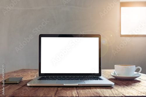 © itchaznong, Fototapeta premium Laptop computer blank screen on woodendesk. Graphic display montage.