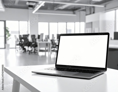 © Boby, Fototapeta premium Laptop Computer Displayed On White Office Table With Blurred Background