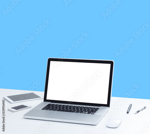 © littlestocker, Fototapeta premium Laptop computer on desk with isolated screen for mockup on blue background. business and technology concept