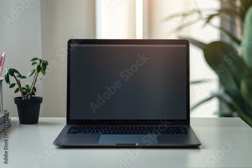 Fototapeta premium Laptop computer placed on a white desk, ideal for workspace or office settings