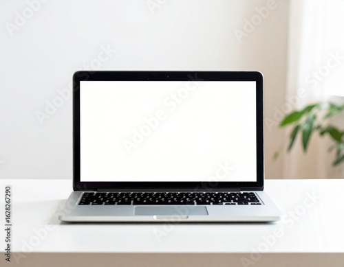 © stetephe, Fototapeta premium Laptop computer with a blank white screen sits on a white desk, with a plant in the background.