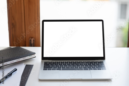 © amnaj, Fototapeta premium Laptop computer with blank white screen on table.